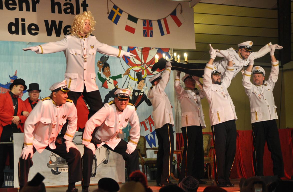 Mit einem lustigen Zwiegespräch von Harald Quast und Achim Schall begann das Programm. Lauter Kapitäne stürmten danach die Bühne, als die Federwölkchen“, das Herrenballett des Vereins, akrobatische Tänze darbot. Ein Feuerwerk an Parodien brannte Ruud Koedooder mit seiner Comedy-Show ab.„Warum soll ich nach dem richtigen Mann suchen, wenn ich mit dem falschen so viel Spaß haben kann“, orakelte die Rednerin Anna Bodewein alias „Et Röschen“, ehe das Geheimnis über die Personen der neuen Tollitäten gelüftet werden sollte.