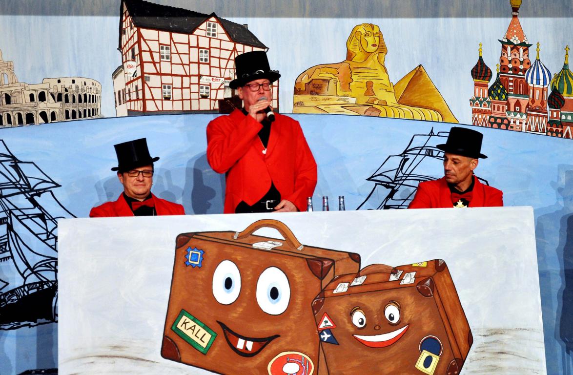 Die „Löstige Bröder“ präsentierten dem Publikum eine Sitzung mit vielen Höhepunkten. Weil Sitzungspräsident Patrick Züll kurzfristig erkrankt war, führte Literat Ralph Drehsen durch das Programm. Ein kurzer Nachruf auf das im Herbst verstorbene Elferratsmitglied Udo Schmidt, der immer zur Stelle war wenn der Verein Hilfe brauchte, wurde vom Publikum mit minutenlangem Applaus bedacht.Weil Sitzungspräsident Patrick Züll plötzlich erkrankt war, führte Literat Ralph Drehsen (Mitte) durch das Programm. Foto: Reiner Züll