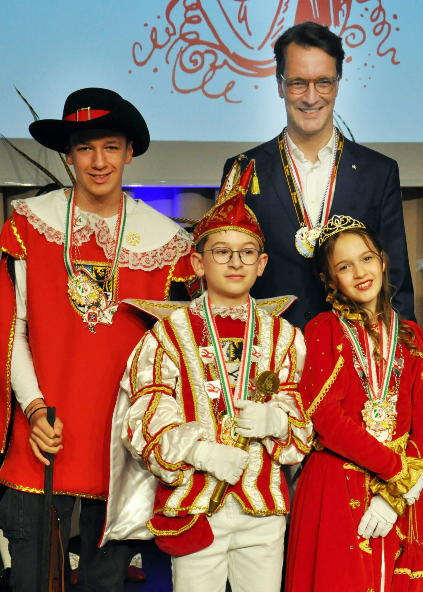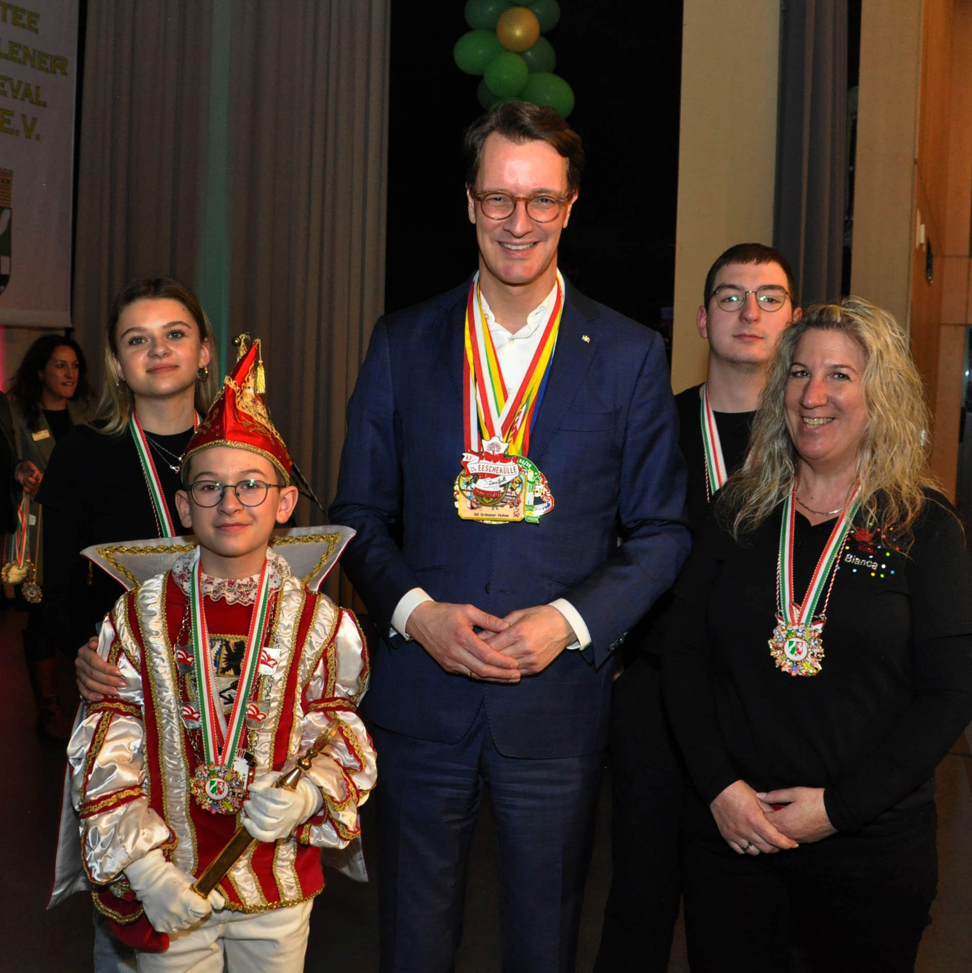 Kall/Würselen – Ministerpräsident Hendrik Wüst wurde in der voll besetzten Stadthalle von Würselen sehnlichst erwartet, hatte er doch 25 Kinderprinzenpaare und -dreigestirne aus Nordrhein-Westfalen zu seinem traditionellen Empfang und einer großen Ordensverleihung eingeladen. Mittendrin auch das Kinderprinzenpaar des Kaller KV „Löstige Bröder“, Emil I. (Sträußl) und Annika III. (Pleuß), dem der Ministerpräsident seine besondere Aufmerksamkeit schenkte. Den hatte Kinderprinz Emil, dessen Vater bei der Flutkatastrophe im Juli 2021 in Kall ums Leben gekommen war, zu seiner Proklamation eingeladen.