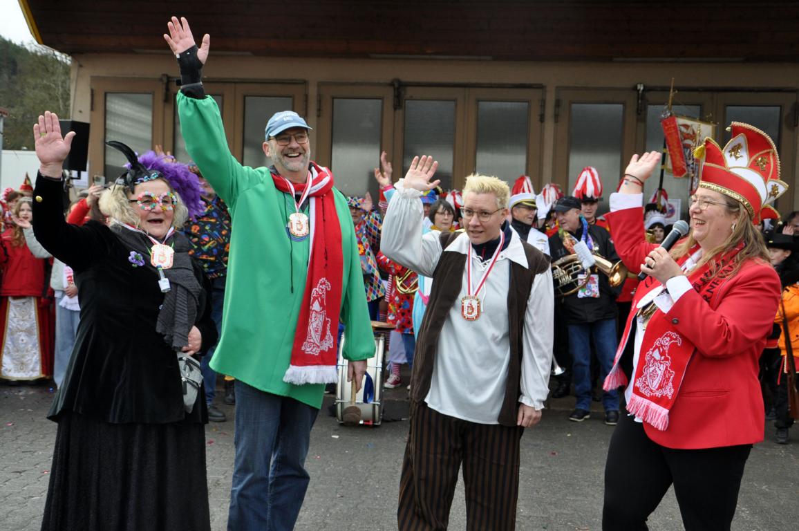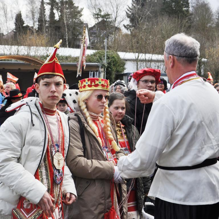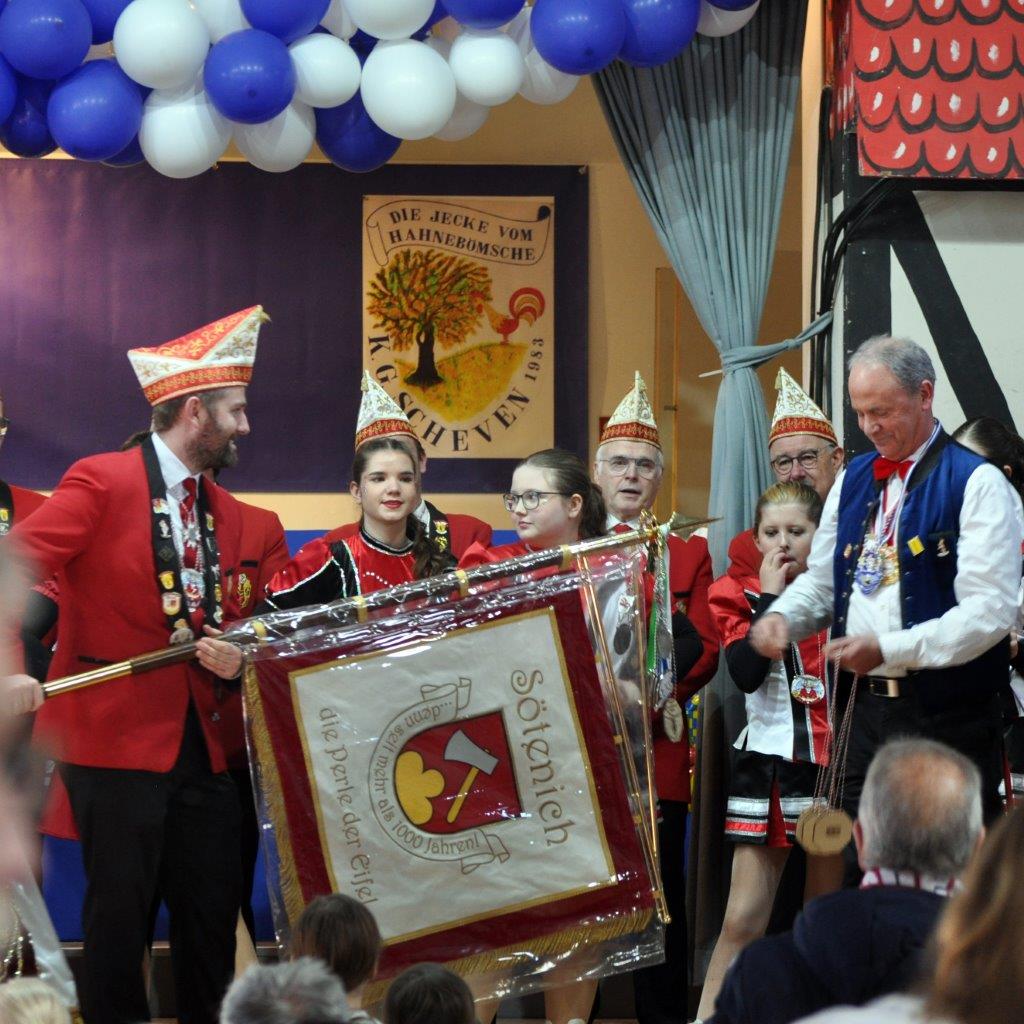 Den Prinzenempfang organisiert hatten auch in diesem Jahr die Schevener „Jecke vom Hahnebömsche“, die seit der Flut im Jahr als einziger Karnevalsverein über einen entsprechenden Saal verfügen. Der Bürgermeister bedankte sich beim Schevener Verein dafür, dass er den von der Flut betroffenen Vereinen ihren Saal zur Verfügung stellen.