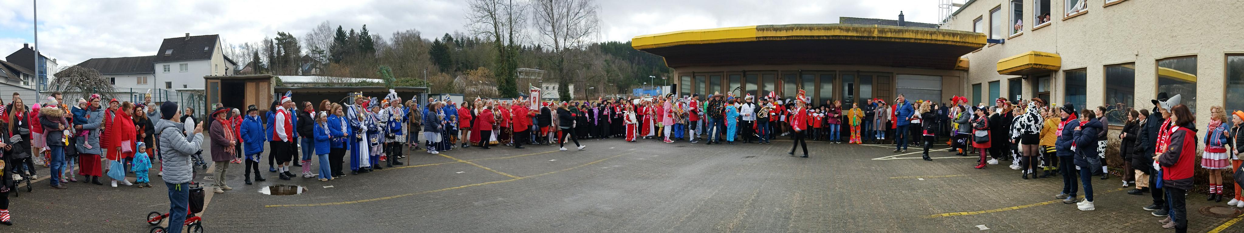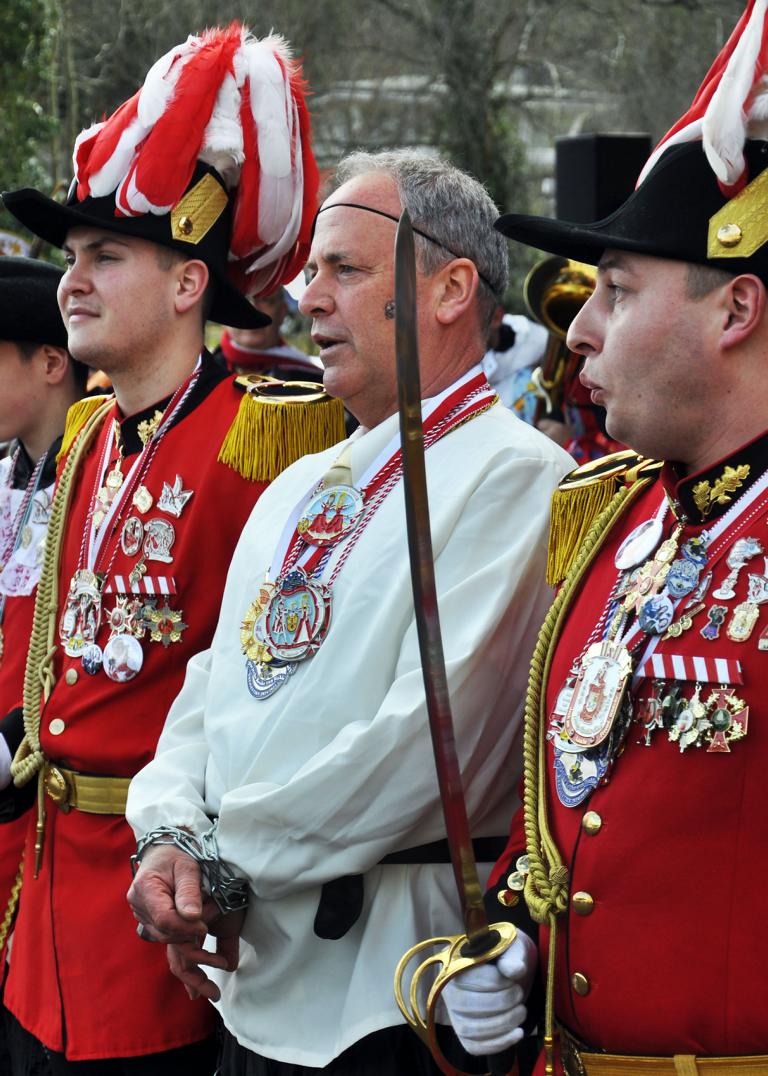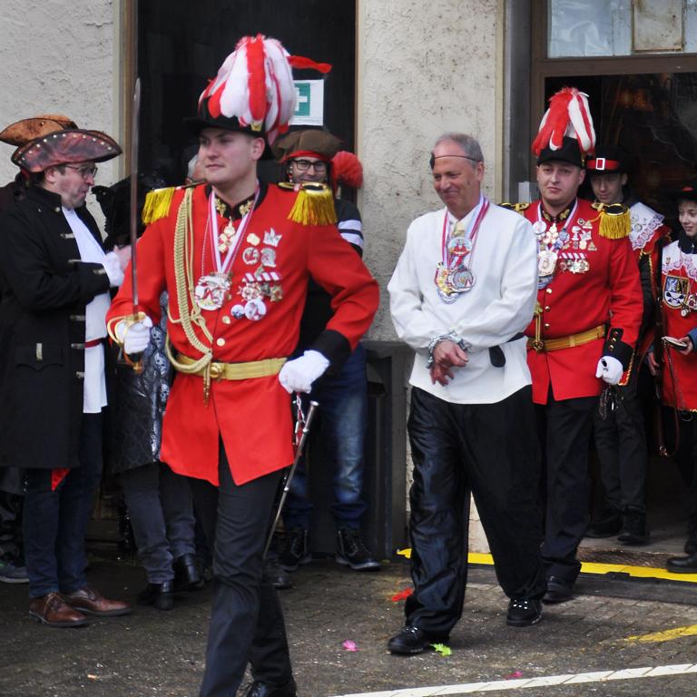 Vom Gasthaus Gier war das Überfall-Kommando des Kaller KV Löstige Bröder zum Marsch in Richtung Rathausnebenstelle an der alten Post gestartet. Unterstützt wurden sie von den Gesellschaften aus Scheven, Wahlen, Sötenich und Sistig. Einige Hundert Kaller Jecken hatten sich dem Umzug angeschlossen, der von der Musikkapelle Kall musikalisch begleitet, und der vom Bezirksdienst der Polizei abgesichert wurde.