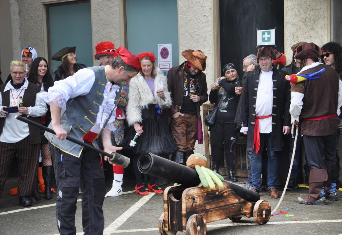 Kall – Bürgermeister Hermann-Josef Esser zeigte sich siegessicher und lachte die Meute aus, die am Vormittag des Weiberdonnerstags mit zwei Kanonen der Prinzengarde und der Musketiere vor der Außenstelle des Rathauses aufmarschiert war, um Essers Beamtenbunker zu stürmen. „Die Schüsse aus Eurer Kanone waren im letzten Jahr doch nicht mehr als eine Blähung“, frotzelte Esser, und kündigte heftige Gegenwehr seiner, als Piraten verkleideten, Rathaus-Mannschaft an. Am Ende aber musste sich der Bürgermeister der närrischen Übermacht und den Schüssen aus der „Möckeflitsch“, der Kanone der Prinzengarde, ergeben und sich in Ketten legen lassen.