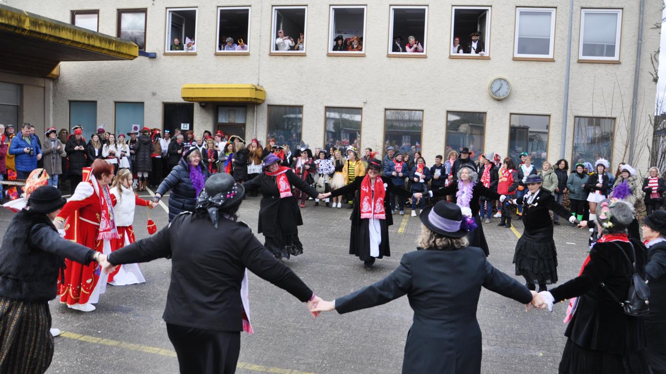 Gardisten der Prinzengarde drangen in den Beamtenbunker ein, legten Hermann-Josef Esser in Ketten und führten ihn auf den Vorplatz ab. Dort verteilte der Bürgermeister noch ein paar Orden, lud zum Umtrunk ein und appellierte an die Anwesenden, sich nachmittags den Karnevalszug der jecke Krohe in Wahlen anzusehen. (Reiner Züll)