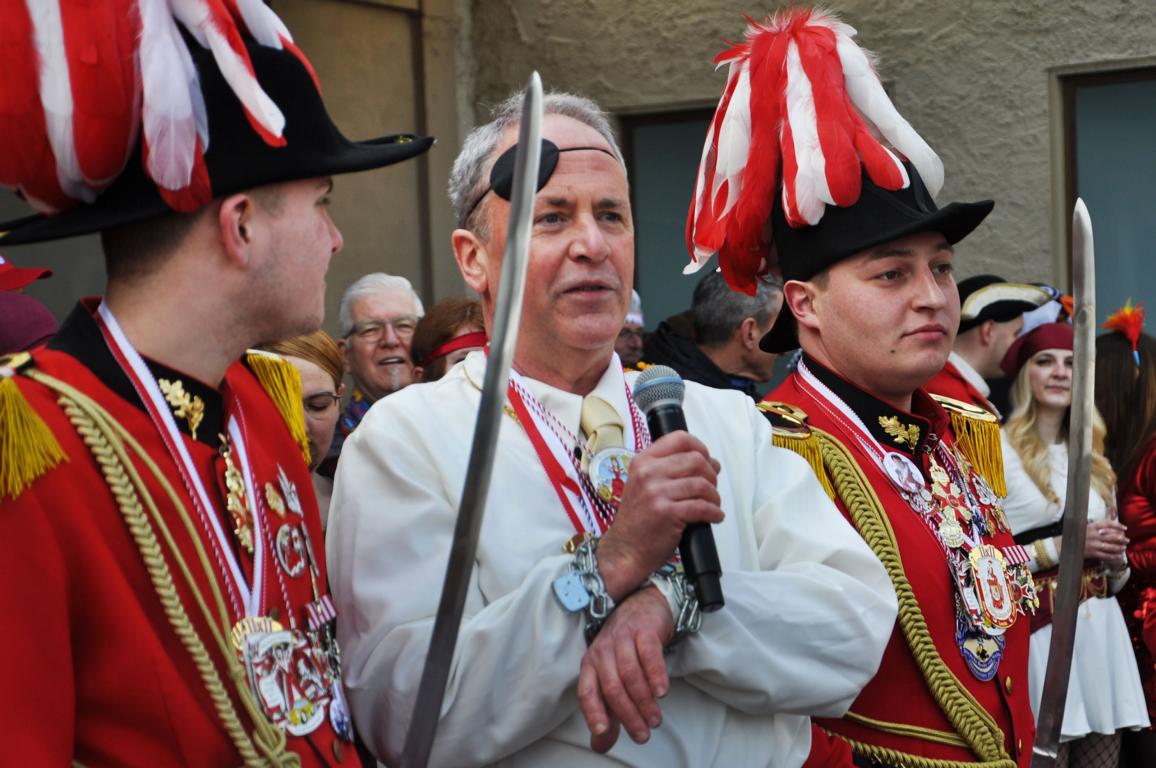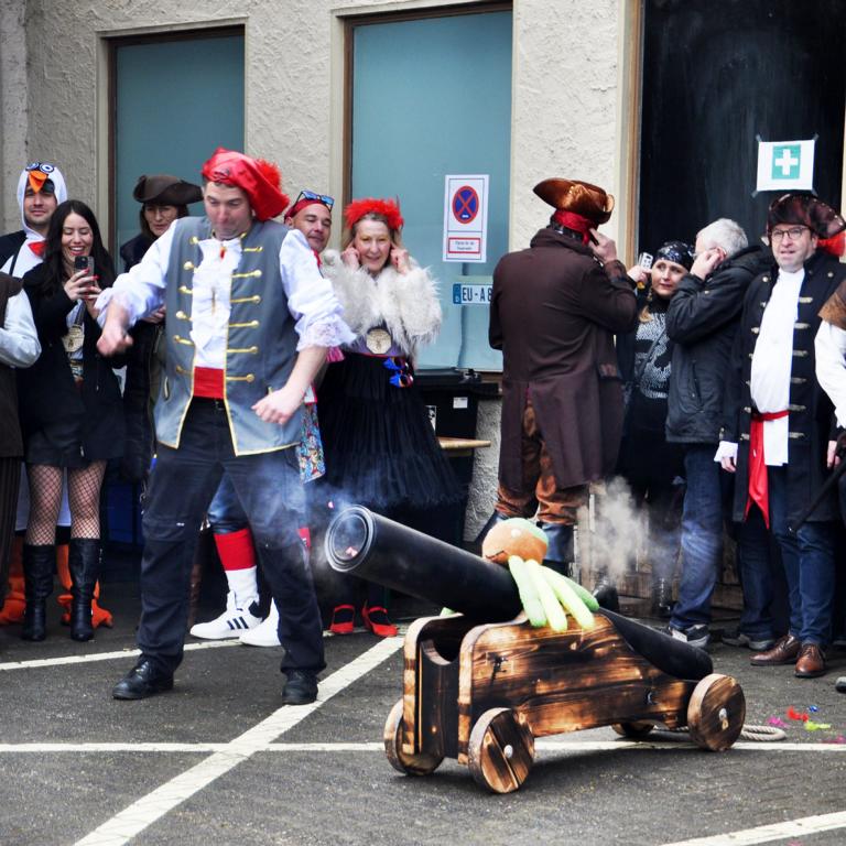 Kall – Bürgermeister Hermann-Josef Esser zeigte sich siegessicher und lachte die Meute aus, die am Vormittag des Weiberdonnerstags mit zwei Kanonen der Prinzengarde und der Musketiere vor der Außenstelle des Rathauses aufmarschiert war, um Essers Beamtenbunker zu stürmen. „Die Schüsse aus Eurer Kanone waren im letzten Jahr doch nicht mehr als eine Blähung“, frotzelte Esser, und kündigte heftige Gegenwehr seiner, als Piraten verkleideten, Rathaus-Mannschaft an. Am Ende aber musste sich der Bürgermeister der närrischen Übermacht und den Schüssen aus der „Möckeflitsch“, der Kanone der Prinzengarde, ergeben und sich in Ketten legen lassen.