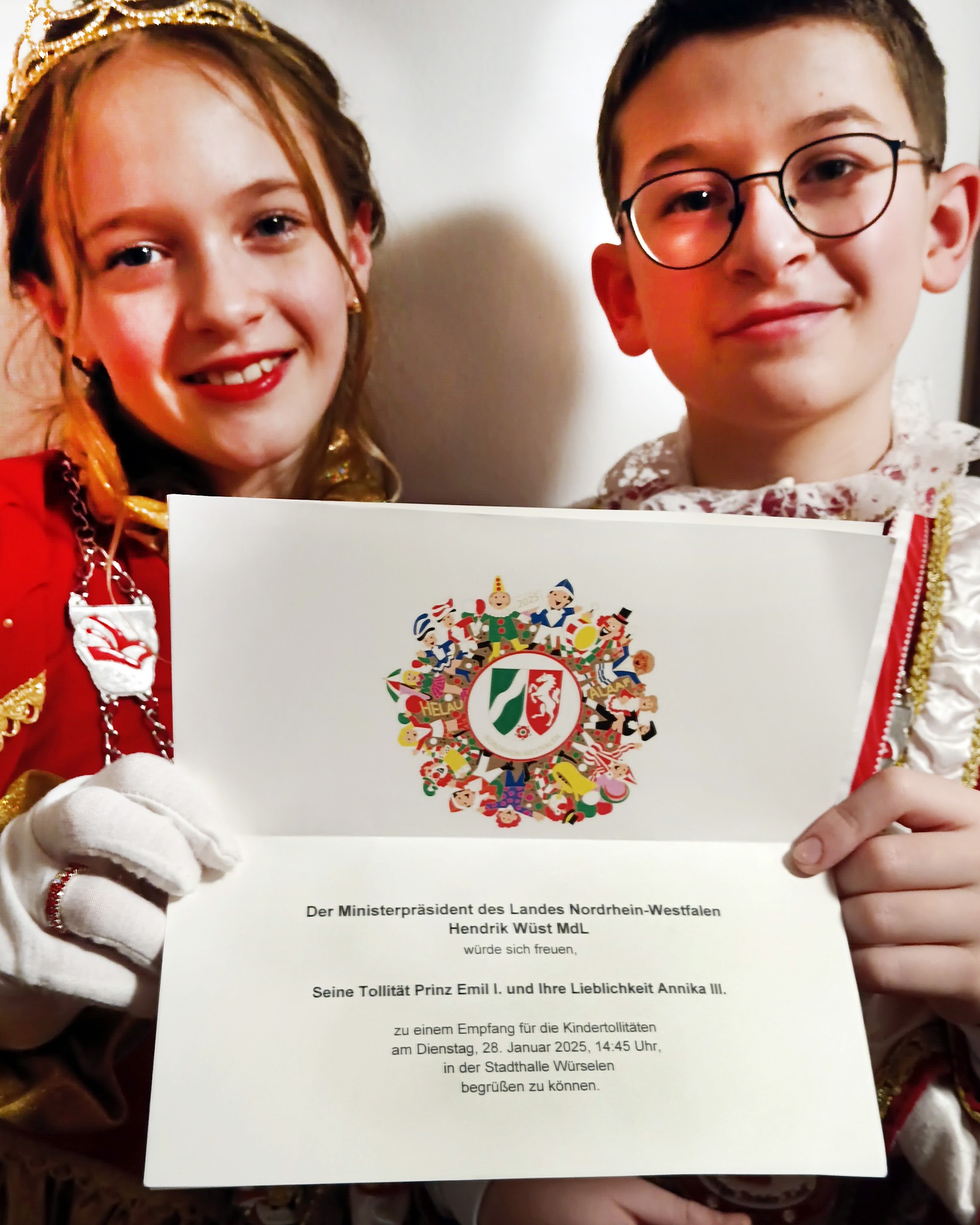 Die Antwort aus der Staatskanzlei in Düsseldorf kam postwendend von Julia Buschhaus, der persönlichen Referentin des Ministerpräsidenten. Der bedanke sich für die freundliche Einladung, bitte aber um Verständnis, das er dieser leider wegen seines vollen Terminkalenders nicht nachkommen könne. Das Kinderprinzenpaar könne dennoch mit dem Ministerpräsident zusammenkommen. Julia Buschhaus versprach Emil, dass sie von Wüst eine Einladung zum Empfang des Ministerpräsidenten für 25 Kinder-Tollitäten aus NRW am Dienstag, 28. Januar, in der Stadthalle Würselen bekomme. Buschhaus: „Vielleicht habt ihr Zeit und Lust dabei zu sein“.