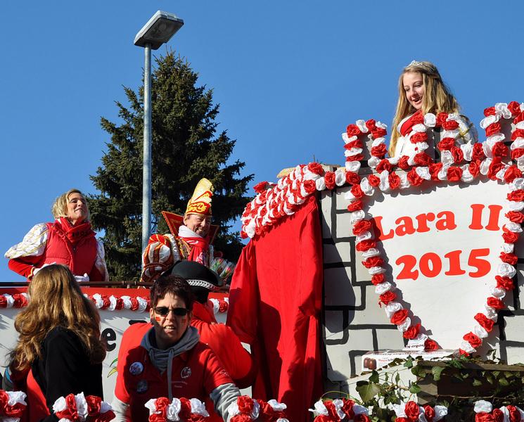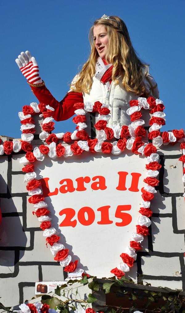 Kall – Auch die Sonne gratulierte dem KV „Löstige Bröder“ am Sonntag zum 111. Geburtstag. Jugendprinzessin Lara II. (Blatt) strahlte mit der Sonne um die Wette, als sie beim Karnevalszug am Sonntag auf ihrem Prunkwagen durch Kall zog. Und auch das Prinzenpaar Hans II. und Gabi I. (Lambert) genoss den Triumphzug durch den Ort in vollen Zügen. Beidhändig warfen Prinz und Prinzessin Schokoladentafeln und Pralinenpackungen unters närrische Volk. 28 Wagen, Fußgruppen und Musikzüge zogen bei strahlendem Sonnenschein durch Kall.