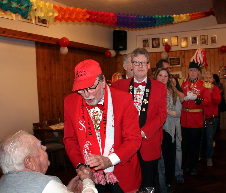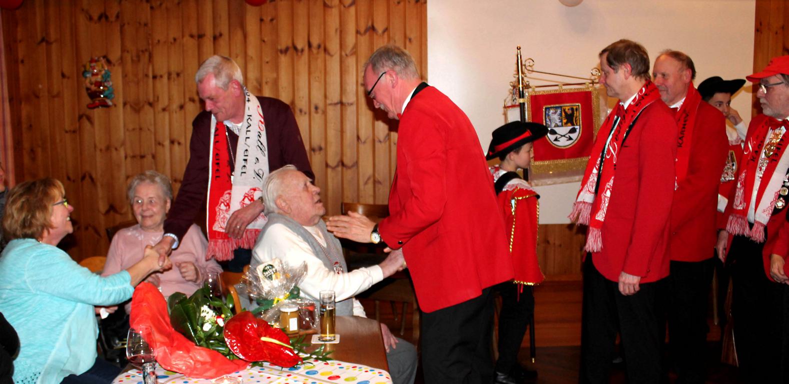 Kall - Unser einziges Ehrenmitglied Willi Hermann ist am Donnerstag, 9. Februar, 84 Jahre alt geworden. Für uns „Löstige Bröder“ war das Anlass genug, dem ältesten Mitglied des Vereines eine tolle Überraschung zu bieten. Ohne Wissen von Willi hatte unser Vereins-Chef Harald Thelen mit Willis Sohn Dieter eine Spontan-Party im Saal Gier organisiert.