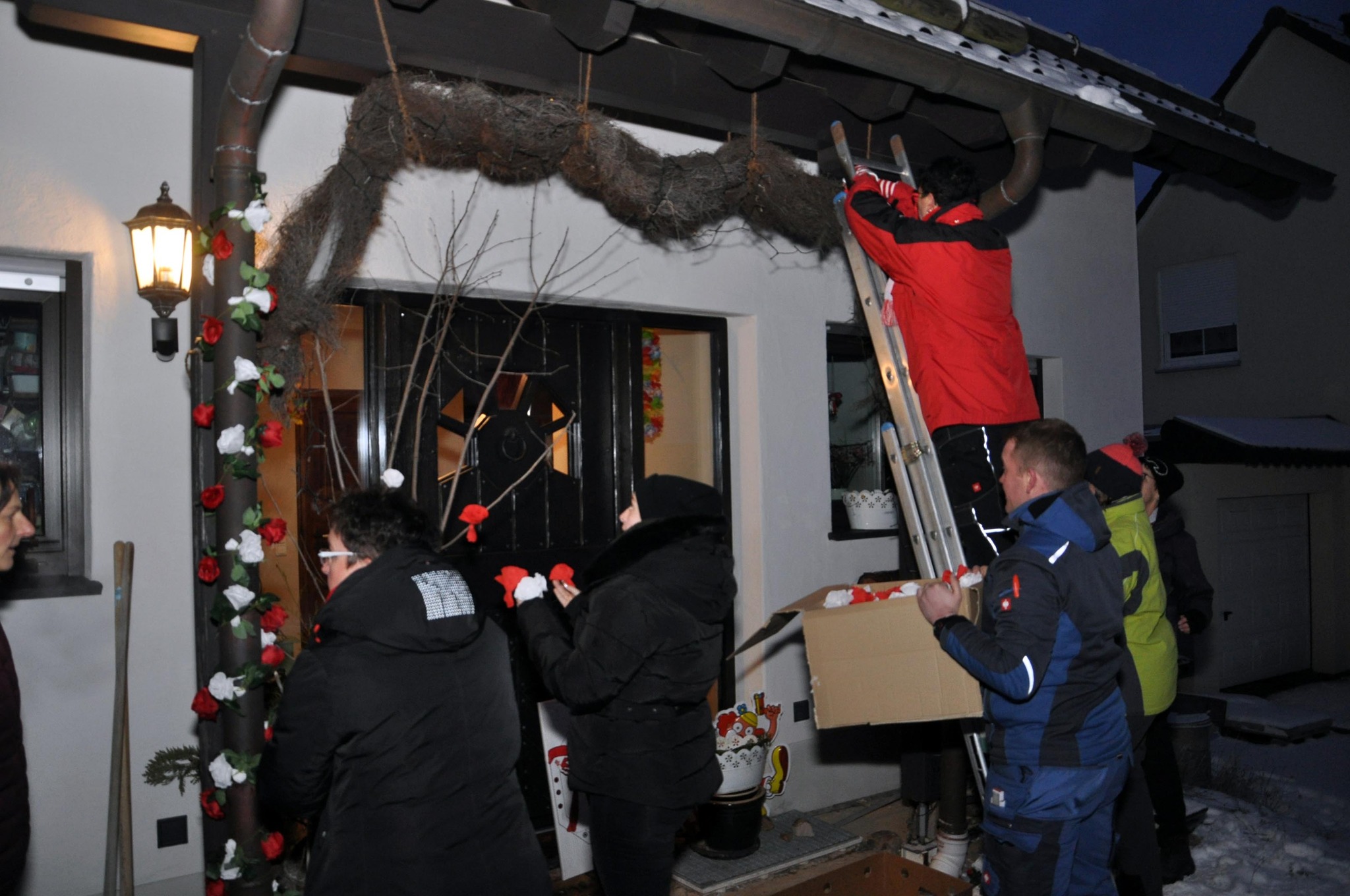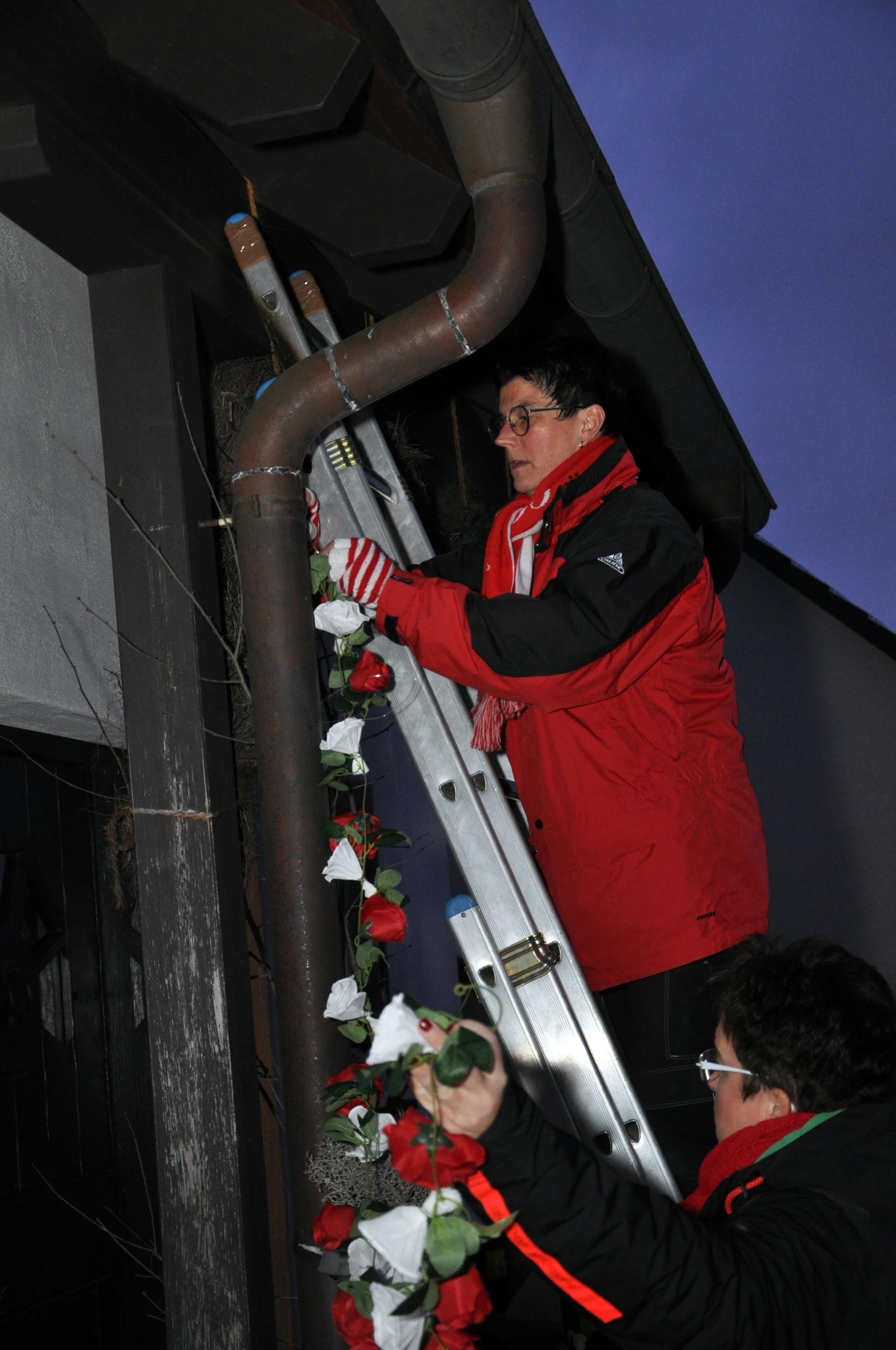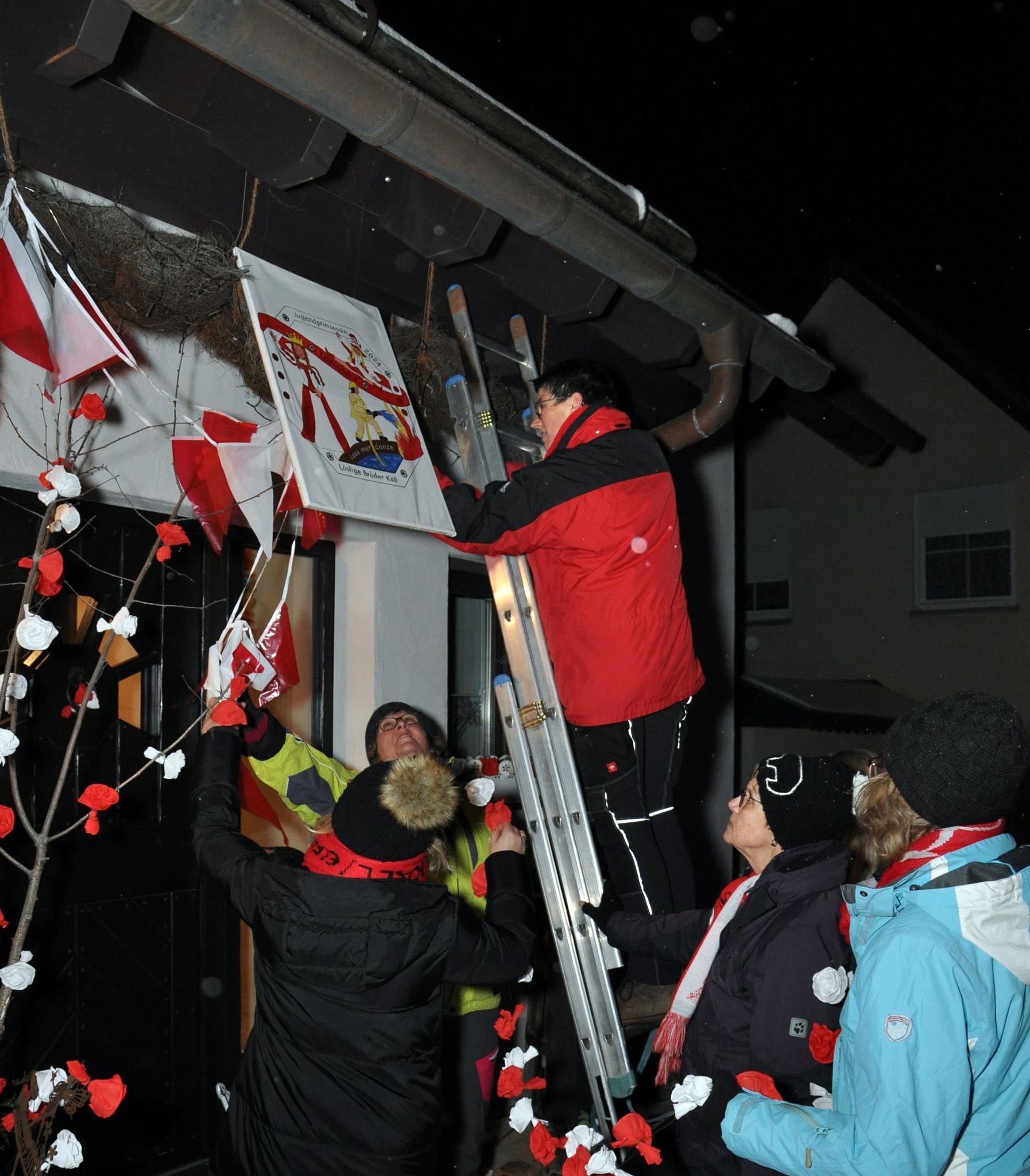Am Montagabend mussten sich die Häuser-Dekorateure allerdings einer besonders schweren Herausforderung stellen, denn Schnee und frostige Temperaturen hatten die Anfahrt zum Falkenweg auf schneeglatter Straße erschwert. Doch immerhin schafften es rund 30 Karnevalisten zum Haus der Jugendprinzessin. Viele fleißige Hände waren damit beschäftigt, die Hausfassade in die weiß-roten Vereinsfarben der Löstige Bröder zu verwandeln. Die rot-weißen Luftballons hatten Sabine Herr und Renate Schüttler an Anbetracht des winterlichen Wetters bereits zuhause in Form gebracht.