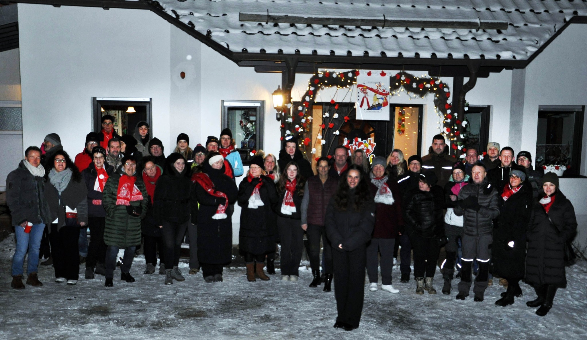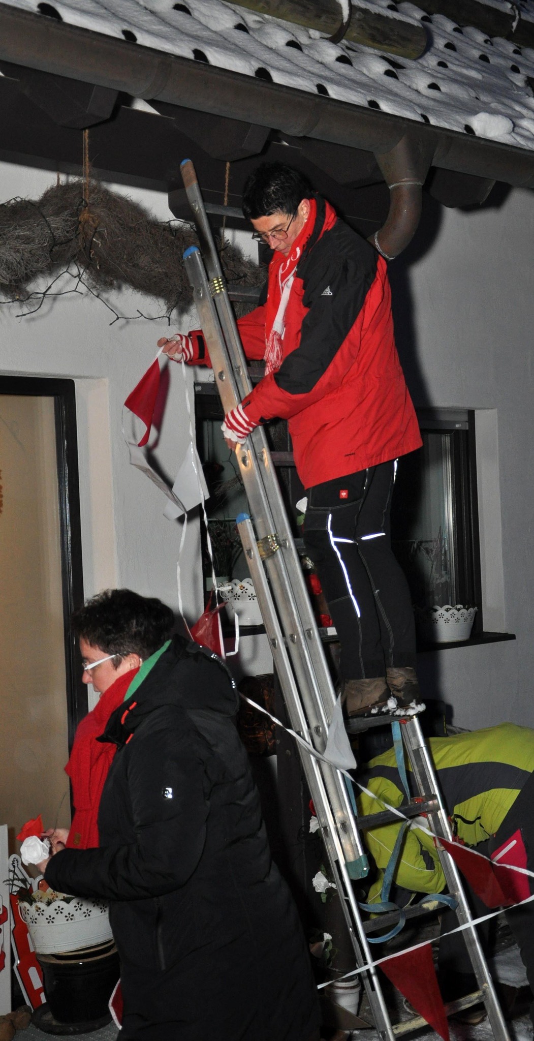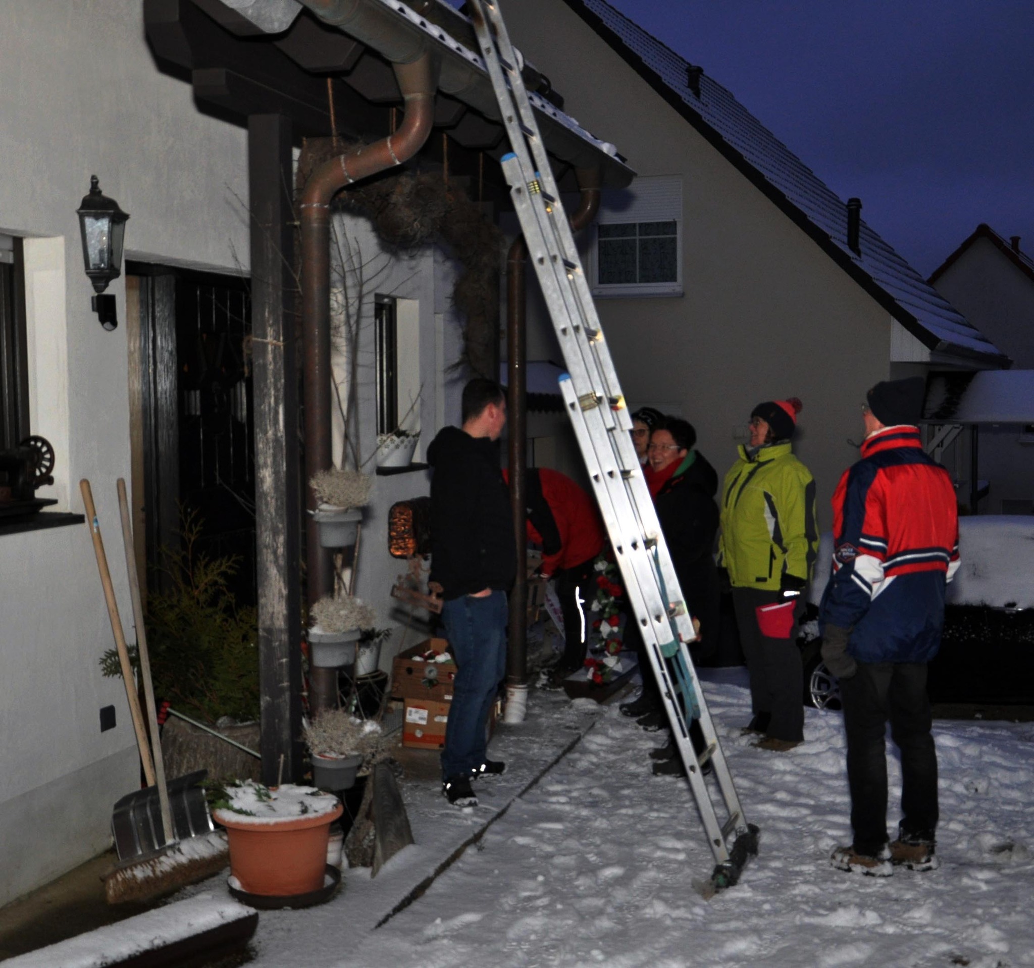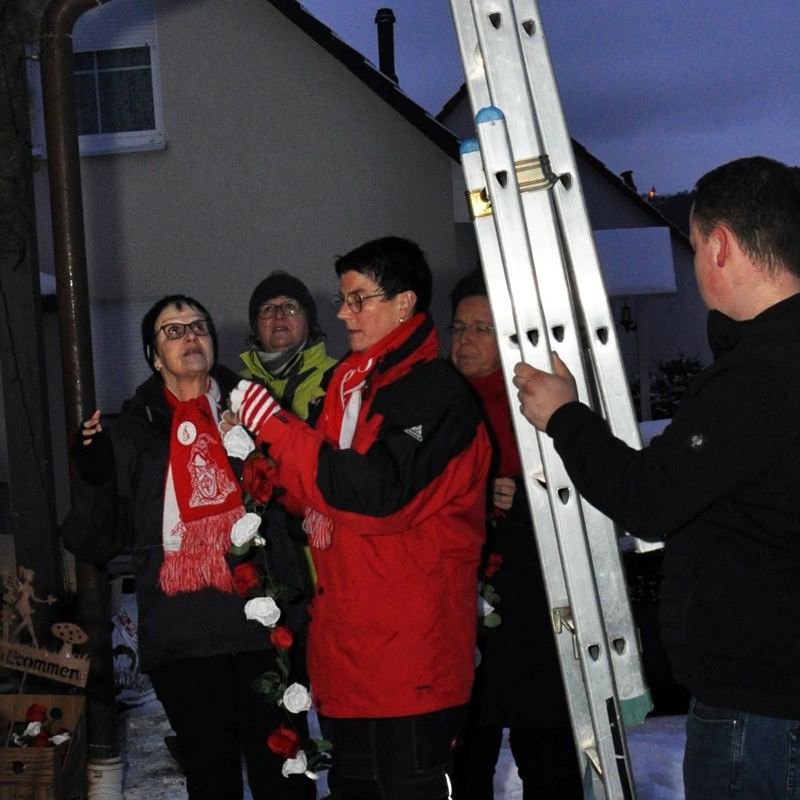 Am Montagabend mussten sich die Häuser-Dekorateure allerdings einer besonders schweren Herausforderung stellen, denn Schnee und frostige Temperaturen hatten die Anfahrt zum Falkenweg auf schneeglatter Straße erschwert. Doch immerhin schafften es rund 30 Karnevalisten zum Haus der Jugendprinzessin. Viele fleißige Hände waren damit beschäftigt, die Hausfassade in die weiß-roten Vereinsfarben der Löstige Bröder zu verwandeln. Die rot-weißen Luftballons hatten Sabine Herr und Renate Schüttler an Anbetracht des winterlichen Wetters bereits zuhause in Form gebracht.