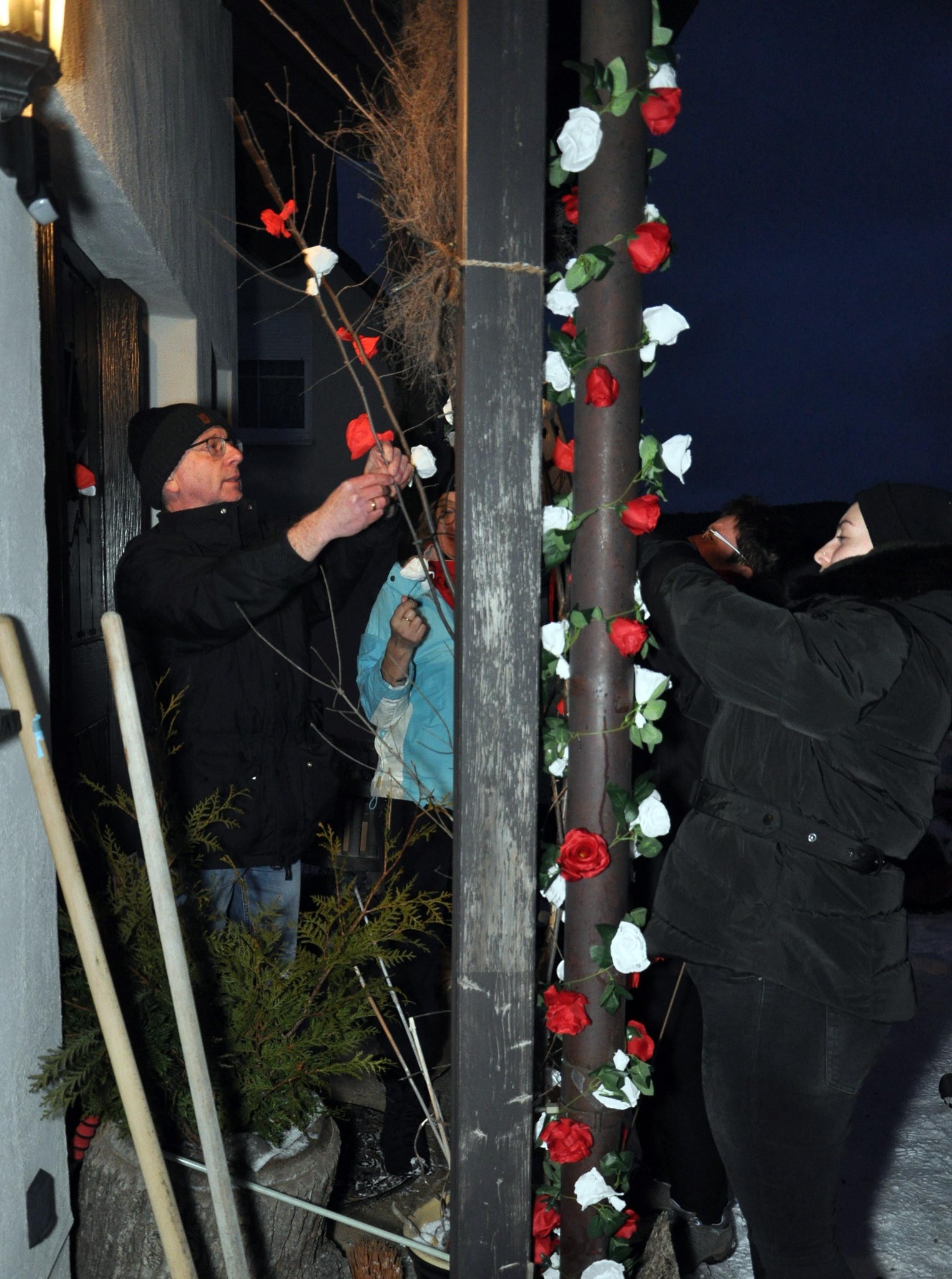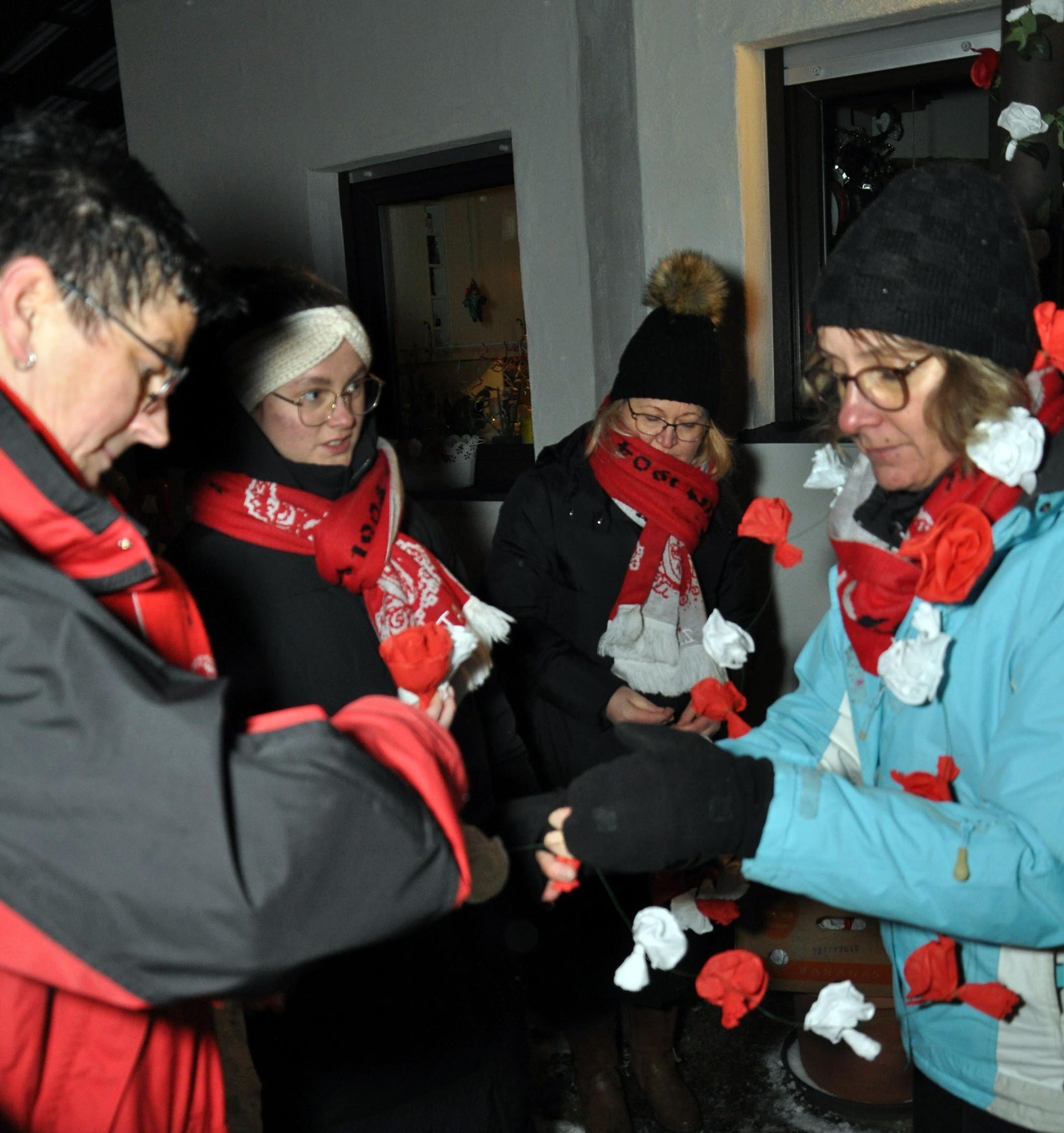 Nach gut einer Stunde war die Arbeit getan, das Konterfei der Prinzessin schmückt nun den Hauseingang, Bäume und Sträucher um das Haus herum sind seit dem Abend mit rot-weißen Papierrosen dekoriert. Akteure und Zuschauer ließen es danach mit heißen (und auch kalten) Getränken und einer wärmenden Suppe gutgehen.