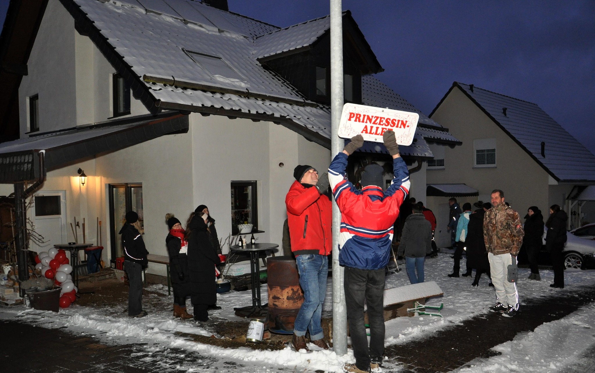 Kall – Ganz schön was los war am Montagabend am Haus der Familie Mertens in Kall, wo die frisch proklamierte Jugendprinzessin des KV „Löstige Bröder“, Larissa I. (Mertens) zuhause ist. Wie es seit vielen Jahren bei den Kaller Karnevalisten guter Brauch ist, werden die Häuser der Tollitäten bunt geschmückt und die Straßennamen kurzerhand in Prinzessin- oder Prinzenallee umbenannt. Organisiert werden die Schmück-Aktionen von Sabine Herr und Renate Schüttler, unterstützt von der Vereinskünstlerin Jaqueline Dreßen, die das obligatorische Bild der Tollitäten malt und darauf die Hobbys der jeweiligen Würdenträger darstellt.