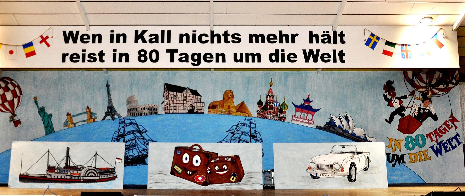 Getreu dem diesjährigen Jubiläumsmotto „Wen in Kall nichts mehr hält, reist in 80 Tagen um die Welt“ haben sich die Bühnenmaler direkt nach Weihnachten, nachdem die Bühnenbauer ihre Arbeit verrichtet hatten, in der Bürgerhalle ans Werk gemacht, um die große weite Welt auf die neu tapezierte Holzplatte zu malen. Dabei wirkt der Ideengeber und Entwerfer des Bühnenbildes bescheiden im Hintergrund.
