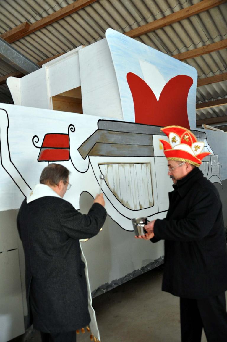 Die Sitzung fand wieder vor einem stattlichen Bühnenbild statt, das Rennszenen am Nürburgring darstellt. Damit hatten die Bühnenmaler der vereinseigenen Farb- und Pinsel AG das diesjährige Session-Motto „Kaller Mototorsports – je oller, je doller“ meisterhaft in Farbe umgesetzt. Und auch der Elferrat zeigte sich sportlich in Rennoveralls. Die Stimmungswogen in der Bürgerhalle schlugen bereits hoch, ehe die Sitzung überhaupt begonnen hatte. Denn Elferrat und Sitzungspräsident saßen auf kleinen Kinder-Bobbycars, als sie sich durch das tobende Publikum einen Weg zur Bühne bahnten.