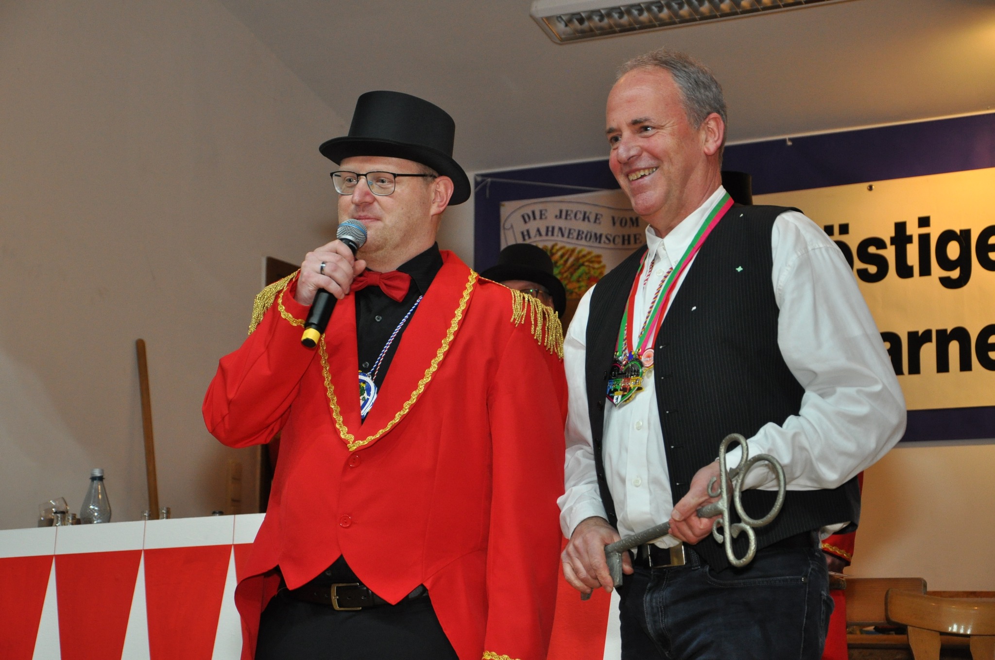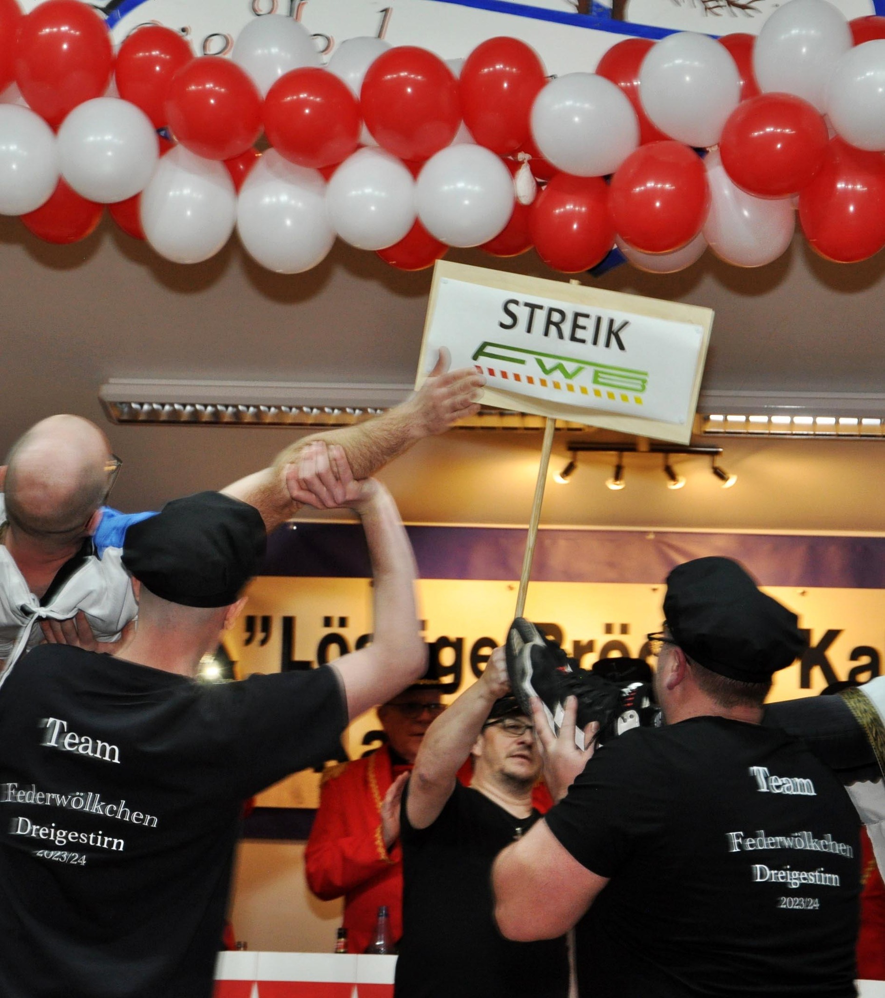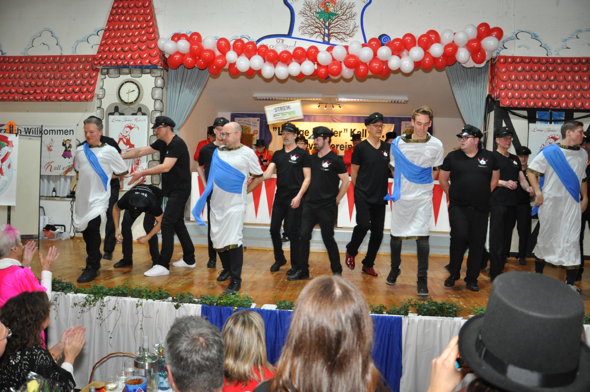 Kostümsitzung der Löstige Bröder 2024 Bei der lustigen Bahnfahrt der Federwölkchen wurde auch der Bahnstreik thematisiert. Foto: Reiner Züll.Der Saal in Scheven war bis auf den letzten Platz besetzt. Zweitweise verwandelte sich die Hütte in ein Tollhaus. Foto: Reiner ZüllBürgermeister Hermann-Josef Esser übergibt Prinz Michael den Rathausschlüssel. Foto: Reiner ZüllDie vereinseigenen Federwölkchen begaben sich mit der - unpünktlichen - Bahn auf Europatou. Hier machen sie Station in der Türkei. Foto: Reiner Züll Corona und Flut hatten dem Prinzenpaar Yvonne und Bernd Kläß (rechts) eine vierjährige Regentschaft beschert. Nun wurden sie von Bürgermeister Hermann-Josef Esser und Situjngspräsident Patrick Züll verabschiedet. Foto: Reiner Züll. Die Kallbachmücken sind seit mehr als 60 Jahren aus dem Kaller Karneval nicht wegzudenken. Am Samstag tanzten sie zu Ehren des neuen Dreigestirnes. Foto: Reiner Züll. Auch die 25 Personen starke Showtanzgruppe "Fusion" aus Keldenich begeisterte das Publikum. Foto: Reiner Züll