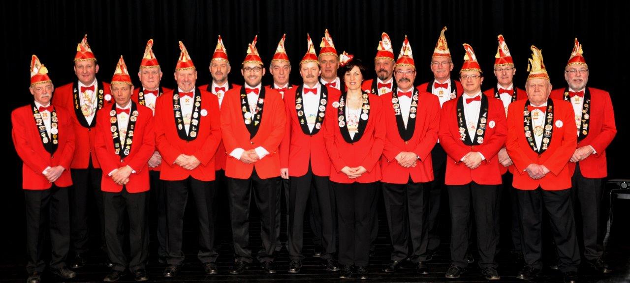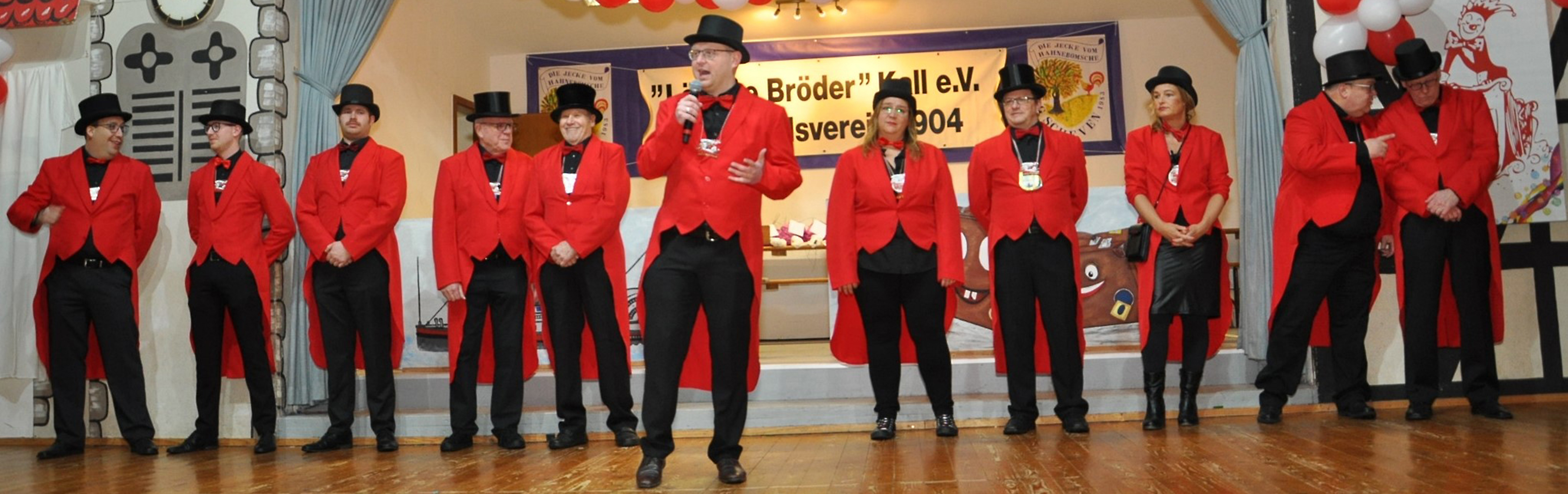 Die Ausrüstung der Truppe besteht aus dem namensgebenden roten Jackett (Rock), einer schwarzen Anzughose, schwarzen Lederschuhen und einem weißen Hemd mit eingesticktem „Löstige Bröder Kall“ Schriftzug. Dazu gehört noch eine rote Fliege und die Narrenkappe darf natürlich auch nicht fehlen. Wenn du Interesse hast ein Rotrock zu werden melde dich gerne bei uns.